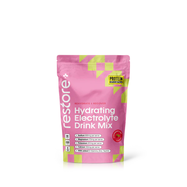 When heat, sweat, and intense exercise drain your essential minerals, your body needs more than plain water. Restore Strawberry Lime delivers a clean, fast-acting electrolyte blend designed to support hydration, fluid balance, and muscle function — naturally. Powered by key electrolytes, coconut water powder, Vitamin C, Zinc, B-Vitamins, and taurine, it helps replenish lost electrolytes and keeps your body functioning at its best. Refreshing, light, and naturally flavoured, it’s your perfect hydration partner.