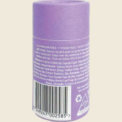 Caprylic/Capric Triglyceride (MCT Oil), Sodium Bicarbonate, Cetearyl Alcohol, Tapioca Starch, Oryza Sativa Bran Cera (Ricebran Wax), Butyrospermum Parkii Butter (Shea), Triethyl Citrate, Jojoba Esters, Silica, Bambusa Arundinacea Stem Extract (Bamboo), Zinc Ricinoleate, Tocopherol (Vitamin E), Citrus Aurantifolia Oil (Lime), Citrus Paradisi Peel Oil (Pink Grapefruit), Citrus Reticulata Peel Oil (Mandarin), Kunzea Ambigua Branch/Leaf/Twig Oil, Limonene, Terpineol, Terpinolene, Pinene, Citronellol. Contains all natural ingredients.