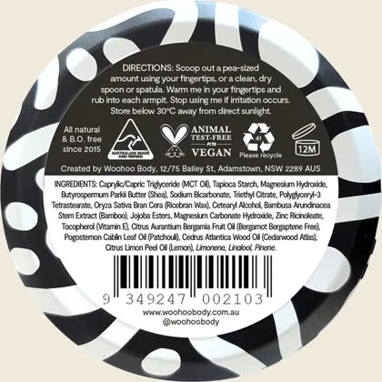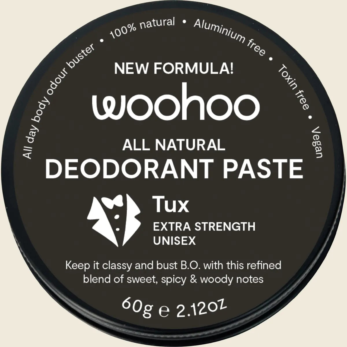 The 100% natural, 100% effective Woohoo Tux Deodorant Paste is all class. This extra strength all natural deodorant paste will banish body odour in style, keeping you fresh all day and into the night. The bergamot and patchouli scent is a top-shelf blend of sweet, spicy and woody notes. Just scoop a small amount, melt it between your fingers, and rub it in like moisturiser for 24 hour protection from body odour.
